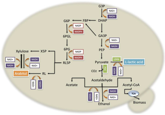 In yeast cells, arabitol synthesis from glycerol is expected to follow similar routes to those leading from glucose [38]. According to the genome annotation, after glycerol is assimilated by the cells, it follows two steps of phosphorylation and is converted into pyruvate, producing two NADH molecules (Figure 4). This latter compound may then follow one of two pathways, one being the conversion to glyceraldehyde-3–phosphate (GA3P) by the enzyme triose phosphate isomerase, with subsequent conversion to pyruvate, which is in turn converted into l-lactic acid by the NADH-dependent bovine lactate dehydrogenase, resulting in a NADH surplus per mol of consumed glycerol under oxygen-limited conditions.