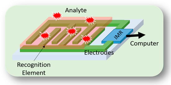 Illustration of a biosensor for the detection of microorganism including a recognition element which can be any specific agent, microelectrodes for impedance measurement, electronic impedance reader (IMR). The output of the IMR device is sent to computer.