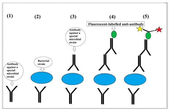 The biosensors used for the detection of intact bacterial cells commonly employ different optical, electrical and chemical detector techniques. The optical technologies mostly rely on the traditional sandwich technique used for immunoassay analysis, in which the bacterial cells are specifically captured by the antibodies that are immobilized on the kit, and the captured cells are recognized by a second specific antibody conjugated to a fluorescent/luminescent dye [,,] (Figure 3). Myong song and his colleagues for instance, used laser induced fluorescence (LIF) for recognition of the antibody-bacterial cell (Bacillus globigii) reactions in a CMOS system [].