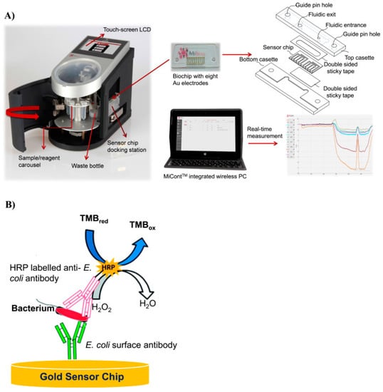 It is possible to apply Fibre Optic Biosensors (FOBs) in the sandwich structure, in which the antibodies are immobilized on an optical fiber and cells consequently attached to them. The binding of a secondary labeling factor to this overall complex will change the optical signal passing through the fiber []. Altintas and his colleagues, for instance, were recently able to use a combination of a microfluidic device and a horseradish Peroxidase (HRP)-conjugated biosensor to design an automated labour free device for the detection of E. coli. The electron required for the reduction of H2O2 into H2O by peroxidase is supplied by TMB (3,3′,5,5′-Tetramethylbenzidine), and all the electrical changes can be detected by a sensitive gold electrode (Figure 4) []. Yao et al. used a bacteriophage as the specific biosensor for the detection of E. coli in a CMOS based integrated sensor system []. Nikkhoo and her colleagues were able to improve the sensitivity of the bacteriophage receptor with the employment of integrated ion-sensitive field-effect transistors (ISFETs) implemented in conventional 0.18 μm CMOS with additional post-processes, most notably a PVC-based potassium-sensitive membrane atop the chip []. Mejri et al. indicated that the application of a bacteriophage for the detection of a bacterial species is more specific and accurate than the use of antibodies since a phage is able to generate successive dual signals of opposite trends over time []. Specifically, the initial increases in the impedance due to the attachment of the bacterial cells to the phages is followed by a sudden decrease in this value due to bacterial cell lysis (as a result of lytic activity of phages) [].