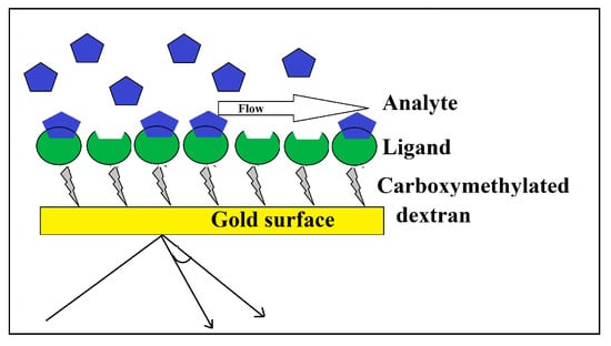 The development of different high affinity molecules, such as antibodies, phage, and other natural/synthetic factors for the detection of specific moieties, such as antigenic epitopes, receptors and specific hydrocarbon, respectively, on the surface of bacteria have been improving optical based devices for the detection of microorganisms []. Furthermore, scientists have been focusing on a way to resolve the limitation of the sample preparation step using the application of so-called label free optical methods, such as Surface Plasmon Resonance (SPR) (Figure 5) []. In SPR systems, plane-polarized light passes through a glass prism to reach a transducer surface, which, in response, produces electrical pulses. Attachment of specific receptors (such as an antibody, lectin, and bacteriophage) to this surface makes this transducer specific to a special type of analyte; any transducer-analyte binding will be associated with changes in the electrical pulse []. Bouguelia et al., for instance, were able to use this system for the label-free and real-time monitoring of single cell multiplying bacteria on a biochip []. Yoon et al. employed radiofrequency (RF)/microwave microstrip bandpass filter circuits in which the bacteria present in water samples were trapped atop the planar filter []. The bacterial cells so trapped change the relative permittivity of the insulating material, thus altering the filter’s frequency response. However, this system is only able to detect the presence of microorganisms and is not able to differentiate between different types of microorganisms. Therefore, such systems are not yet of immediate benefit in routine microbiology laboratories for detection of various microorganisms. While immobilization of an array of specific antibodies on such chips and analysis of the outgoing data from this system can be applied for the specific detection of single or multiple known microorganisms even in a combined contamination or complex environmental or clinical sample, this chip is applicable for detection of only the bacteria that are specific for those antibodies.