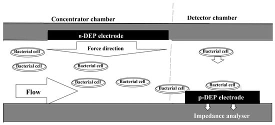 A microfluidic system to direct and concentrate bacterial cells on an electrode based on both flow and dielectrophoresis. The cells collected at the positive side of electrophoresis screen are detected by an impedance analyzer.