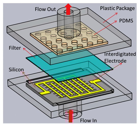 Cross-sectional view of the integrated the electrochemical impedance spectroscopy for detection of bacteria; in this system, bacterial suspension are flown into a nanopore filter above the electrodes where the cells trapped in the filter and the rest of the suspension is flown out [] (This Figure is used from Elsevier with permission).