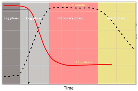 Commercially available bactometer devices use a combination of conductance, capacitance, and impedance to perform several microbial analyses per hour [], and are able to perform microbial analysis on different types of microorganisms, including bacteria, fungi, viruses, algae and protozoa. The changes in the output electrical signals throughout microbial growth depend on the nature of media, microbial primary inoculation, microbial doubling rate, and the presence of optimal physicochemical condition, including pH, temperature []. The threshold time for each microorganism is the time that the electrical index curve starts to accelerate [] (Figure 10), and starts in a concentration of 107 bacteria (2–11) and 104–105 yeast (2–10) per millimeter. Since the electrical changes of a microbial environment are influenced by the metabolic activity of microorganisms, the nature of microbial media is a significant factor for more sensitive detection of microorganisms [].
