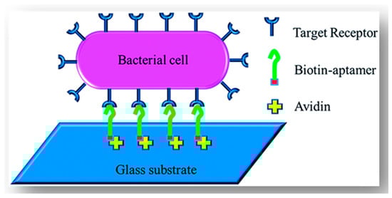 A simple schematic description of the employment of aptamers for the detection of microorganisms. In this condition, the complex of Biotin-aptamer works as a specific intermediate between the microbial strain, which is free in the media) and Avidin, which is stabilized on the surface. The aptamer complex is usually bounded to a recognition marker, such as a fluorescent).