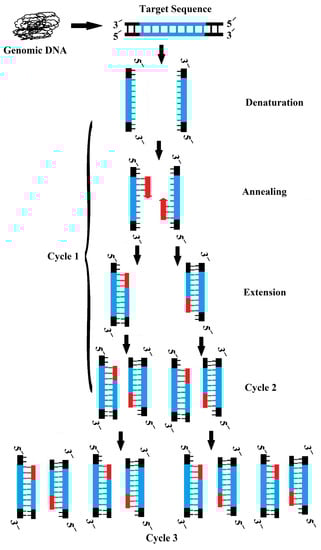 PCR is a technique in which one or more specific fragments of the genome are amplified using specific primers, which are finally detected based on the size of the fragment in conventional PCR, polymerase chain reaction, or fluorescent reporters in real-time PCR []. In conventional PCR (Figure 12), the amplified fragment moves under a special electrical charge that separates the fragments based on their size and thus yields one or more identifiable band(s) onto the gel; the correct band among all of the other unspecific bands is determined in comparison with the size marker, which is run onto the gel at the same time [].