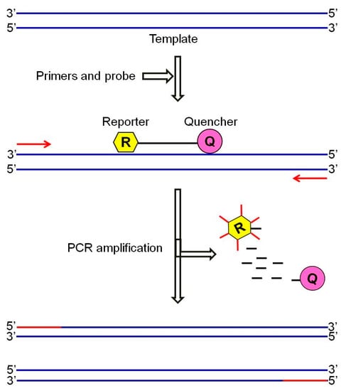 The real-time PCR; in this system, a specific probe labelled to two types of fluorophores, referred to as R for reporter (donor) and Q for quencher (or receptor), sits in the interval of two primers. When the distance between two fluorophores is between 1 and 10 nm, any the excited energy of the R is donated to Q in the form of Fluorescence Resonance Energy Transfer (FRET). Through amplification of the DNA, the R is cut by the amplifier enzyme, which lead to the separation of R and D fluorophores and emission of fluorescence. The level of emission is linearly proportional to the number of probe and genome.