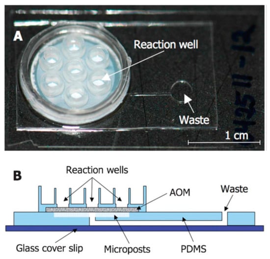 In this system, target specific fluorescent–labelled probes are bound to the target al.ong with the primers, and any single target replication through each single PCR reaction leads to the release of the fluorescent reporter, which is associated with illumination of a fluorescent light []. Since each fluorescence is parallel to one gene amplification, the numbers of fluorescent pulses is a reliable factor to determine the copy numbers of genes based on comparison with the reference samples, which contain a defined number of the gene of interest and are run along with the samples of interests []. Employment of probes linked to different types of fluorescent reporters enables researchers to use qPCR for simultaneous detection of multiple microorganisms in a sample []. The ability to monitor the illumination emitted from the reporters makes qPCR suitable for the design of automated detection systems. Oblath et al., introduced a microfluidic chip with the ability to perform both DNA extraction and real-time PCR (Figure 14) []. The microbial samples were lysed by a heat treatment before addition to micro-wells, and were filtered by an AOM nanofilter to concentrate the DNA samples on the filters. The genomic materials that remained on the surface of the filters underwent a RT-PCR reaction. However, it needs to be mentioned that the huge amount of cell debris through the DNA/RNA extraction can affect the quality of RT-PCR performance, therefore a suitable genome extraction microchip should be designed in a way to separate this cell debris. Furthermore, it must be mentioned that the PCR procedures are very expensive and time-consuming, and therefore, is not presently amenable with the spirit of real-time microfluidic devices which need to be inexpensive [].
