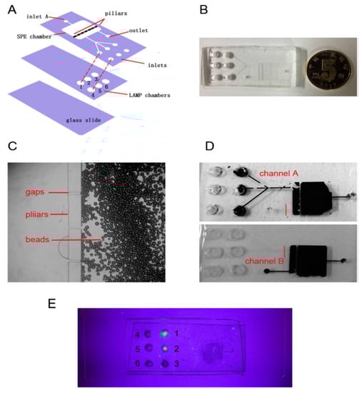 This microfluidic device consisted of two layers; (A) Schematic design of the device; (B) the real assembled device. The cells, DNA extraction reagents and silica beads are directed to the upper layer through the inlets to the SPE (Solid phase extraction) chamber. Following DNA extraction in the SPE chamber, the DNA samples are washed from the beads using distilled water to the second layer (LAMP chamber). The gaps on the micropillars are small enough to prevent bead transfer to the second layer; Subpanel (C) Shows the SPE chamber in which the beads stuck by the row of micro-pillars and the micro-gaps; (D): the solution flow in the chip is showed by an injection of black ink from inlet A flowed to channel A or B; the positive results can be seen by a, green fluorescence under the UV light (E) []. (This Figure is used from Elsevier with permission).
