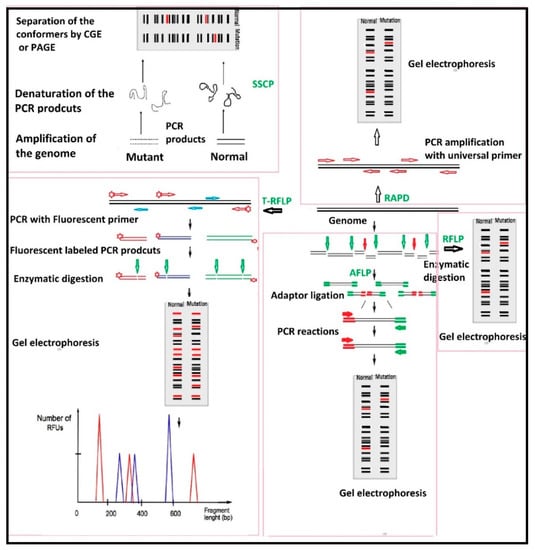 RAPD is a PCR-based polymorphism in which the given DNA is amplified with a universal primer (approximately 10 bp length), and the gel profile of individuals will be different as a result of mutations in the primer annealing sites (Figure 17) [,]. Because of using a universal primer, no specific knowledge of the microbial genome is required for the creation of microbial RAPD profile [,]. SSCP is an effective screening method to distinguish a specific genomic variation (like a specific strain) among a wide range of microorganisms. In this technique, following amplification of the genome, the PCR products are denaturised in the form of single strand DNAs. The presence of any mutation in the genome sequence leads to changes in the conformation of these single strand DNAs, which can be detected by separation onto polyacrylamide gel (PAGE) or Capillary Gel Electrophoresis (CGE) (Figure 17) [].