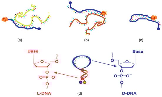 The structure and function of molecular beacons (MBs); MBs are target-specific single strand DNAs flanked with two complementary sequences labeled with a fluorophore (at one end) and a quencher (at the opposite end). (a) and (b) The MB-DNA target hybridization creates a distance between quencher and fluorophore, but (c) The hydrogen bonds between two complementary sequences at two ends make a hairpin structure in which any fluorescence released by the fluorophore is captured by quencher. (d) The production of d-DNA in the hairpin and l-DNA in the Double helix DNA.
