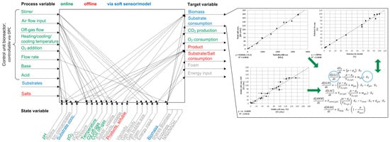 Main correlations between process, state, and target variables according to []. In this experimental set-up green, red, and blue variables can be measured/controlled online, offline, or via a soft sensor/kinetic model, respectively (left). The target variable biomass can be measured indirectly via turbidity (linear correlation) or Raman spectroscopy (PLS). The substrate consumption, e.g., glucose, can be calculated due to the relationship between cell and substrate concentration in a macroscopic model based on Monod equations (right).