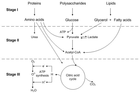 Schematic overview of the main catabolic metabolism divided into three stages, adapted from [].