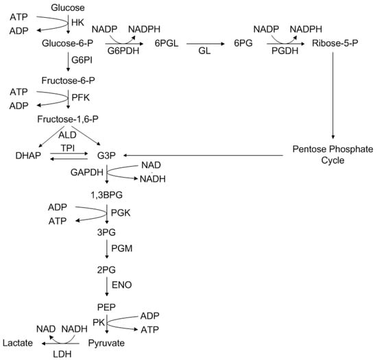 Production of lactate and pyruvate in glycolysis. HK, Hexokinase; G6PI, Glucose-6-phosphate isomerase; PFK, Phosphofructokinase; ALD, Aldolase; TPI, Triosephosphate isomerase; GAPDH, Glyceraldehyde-3-phosphate dehydrogenase; PGK, Phosphoglycerate kinase; PGM, Phosphoglycerate mutase; ENO, Enolase; PK, Pyruvate kinase; LDH, Lactate dehydrogenase; G6PDH, Glucose-6-phosphate dehydrogenase; GL, 6-Phosphogluconolactonase; PGDH, Phosphogluconate dehydrogenase; DHAP, Dihydroxyacetone phosphate; G3P, Glyceraldehyde 3-phosphate; 1,3BPG, 1,3-Bisphosphoglycerate; 3PG, 3-Phosphoglycerate; 2PG, 2-Phosphoglycerate; PEP, Phosphoenolpyruvate; 6PGL, 6-Phosphogluconolactone; 6PG, 6-Phosphogluconate.