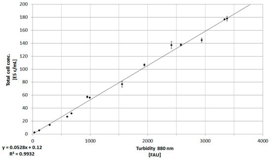 Correlation between offline determination of total cell concentration (E5 cells/mL) and online turbidity measurements (880 nm, FAU). Error bars represent the double determination of cell concentration, as well as the error of the probe (0.75%). The coefficient of determination for this linear relation is >0.99.