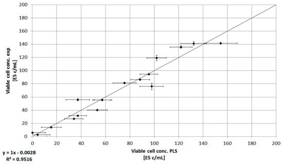 Correlation between offline viable cell concentration (E5 cells/mL) determination and PLS (NIPALS)-based viable cell concentration (E5 cells/mL). Error bars represent the double determination of cell concentration, as well as the model error (RMSE ≤ 13.82). The coefficient of determination for this linear relation is >0.95.