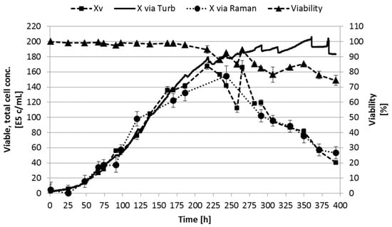 Both techniques generate reproducible data and predictions. The acquisition of turbidity is more easily available and is simpler to integrate and interpret than Raman spectroscopy coupled to PLS. However, turbidity probes are only able to determine the total cell concentration based on the optical density of the culture suspension instead of the viable concentration and are affected by air bubbles and noncellular particles []. Regarding the productivity of secondary metabolites or recombinant proteins like monoclonal antibodies in the stationary phase of a (fed-)batch culture, the cellular state of the culture, and therefore its viability, is of utmost importance []. Hence, techniques that are able to determine the viable cell concentration are in favor. This prediction can efficiently be accomplished by Raman spectroscopy or, for example, near-infrared and impedance measurements []. The discrepancy between the results of Raman spectroscopy and turbidity can be seen in Figure 7.