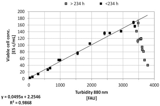 Correlation between offline viable cell concentration (E5 cells/mL) determination and online turbidity measurements (880 nm, FAU) prior to and after 234 h bioreactor cultivation. Error bars represent the double determination of cell concentration, as well as the deviation of the probe (0.75%). The coefficient of determination for this linear relation is >0.98 for t < 234 h.