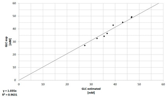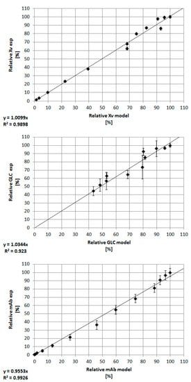 Comparison between offline measurements (exp) and model-based prediction of the glucose concentration. The deviation represents the offline double determination of the glucose concentration. The coefficient of determination for this relation is ≥0.96.