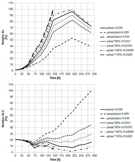 The cellular state, together with the product and glucose concentration, can be predicted sufficiently, as seen in Figure 9. The coefficient of determination for each prediction is greater than 0.92. In order to improve the prediction quality, the Markov Chain Monte Carlo method can be used for the prediction of parameters that are difficult to obtain such as mglc, Kgln, or Kglc []. However, even parameters that can be derived from experimental data [], such as µmax or yield coefficients (e.g., YX/glc, YX/gln), exhibit a significant influence on model variables, especially [Xv] and [GLC]. The model parameter µmax, for example, varied according to the minimal and maximum values reported for mammalian cells, as well as ±5% and ±10% of the experimentally determined value in order to examine its influence on the course of the viable cell and glucose concentration (Figure 10).