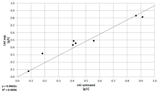 Comparison between offline measurements (exp) and model-based prediction of the lactate concentration. The deviation represents the offline double determination of the lactate concentration. The coefficient of determination for this relation is ≥0.90.