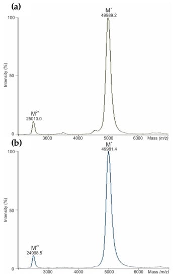 (a) Matrix-assisted laser desorption ionization time of flight mass spectrometry (MALDI-TOF-MS) analysis of intact mass for NovoSeven®, and (b) for AryoSeven™.