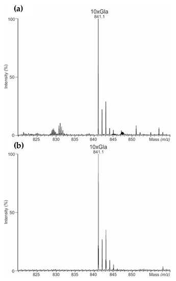 (a) Mass spectra of γ-carboxylation detected using liquid chromatography accurate mass spectrometry (UHPLC-QTOF-MS)/MSE in NovoSeven®, and (b) AryoSeven™. Not assigned signals were artifacts.