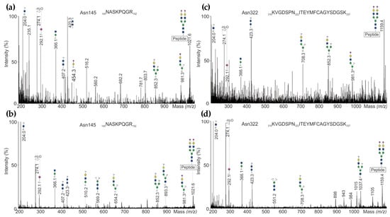 (a) UHPLC-QTOF-MS/MSE spectra of N-glycopeptides representing N-glycosylation site Asn145 detected in NovoSeven®, and (b) in AryoSeven™; (c) site Asn322 in NovoSeven®, and (d) in AryoSeven™.