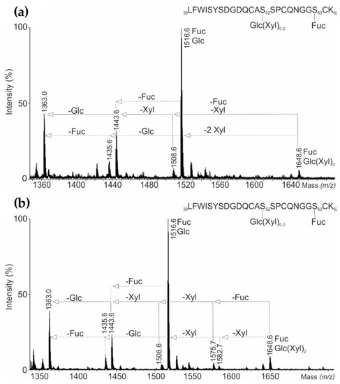 - Macek, B.; Hofsteenge, J.; Peter-Katalinic, J. Direct determination of glycosylation sites in O-fucosylated glycopeptides using nano-electrospray quadrupole time-of-flight mass spectrometry. Rapid Commun. Mass Spectrom. 2001, 15, 771–777. [Google Scholar] [CrossRef] [PubMed]