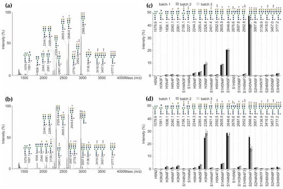 (a) MALDI-TOF-MS spectra of the most abundant permethylated N-glycans released from NovoSeven®, and (b) AryoSeven™. (c) Relative abundance of permethylated N-glycans from three batches of NovoSeven®, and (d) AryoSeven™ were calculated. Standard deviations were calculated from technical triplicates.