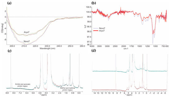 (a) The overlay of far-UV CD spectra obtained from innovator and AryoSeven™. (b) FTIR spectra indicating a high similarity of the amide I and II bands between both biologics (light blue; NovoSeven®, and red, AryoSeven™). (c,d) NMR spectral fingerprinting showing all protons in methyl and methine region (zero to three parts per million) as well as amide and aromatic region (six to eight parts per million) (green, NovoSeven®, and red, AryoSeven™).