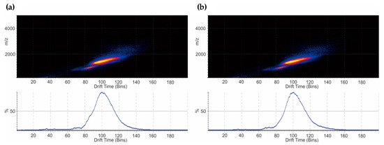 Using IMS as a powerful visualization technique under denaturing conditions supported the biosimilarity study [35,36]. The separation of ion species with different size, charge and shape was performed in a drift cell filled with a buffer carrier gas (N2) in the presence of an electric field, where the speed of an ion species plays a critical parameter [37]. The data from IMS were highly comparable.