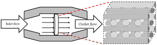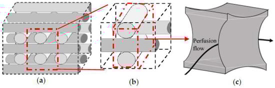 16]. This structure can be fabricated by assembling polymeric fibers with a repeated pattern, or by using 3D printers. Hossain et al. initially discussed the fluid velocity drop, downstream of the rear side of the fibers, as a design weakness of this structure. This fact is a considerable phenomenon, particularly in the case of relatively slow perfusion or low nutrient concentrations in the feed stream [