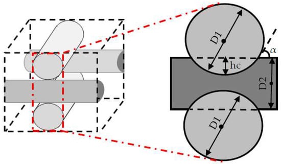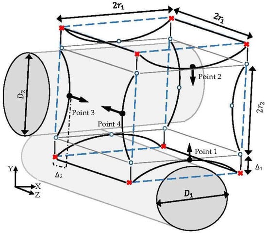 . The diameters of the primary fibers are defined by introducing indicator points 1 and 2 at the center line of the cube’s front face in the Y axis direction. The normal distance Δ between each indicator parameter and the center of the closest imaginary cube’s edge illustrate the corresponding fiber’s diameter D according to Equation (10). Accordingly, secondary fibers are specified by indicating the coordinates of points 3 and 4 with respect to the closest imaginary edge at the cube’s left face. Movement of the indicator points from the cube’s edge in their corresponding faces (in the Y direction for points 1 and 2, and in the Z direction for points 3 and 4) indicates the main design characteristic parameters of various possible structures. The movements are specified by setting the displacement values Δ s. Moreover, 12 extra points, named ‘free point’, are used to illustrate the rest of the corners and edges in the simulation software. The locations of the free points are adjusted according to the coordinates of the indicator parameters in the three-dimensional space.