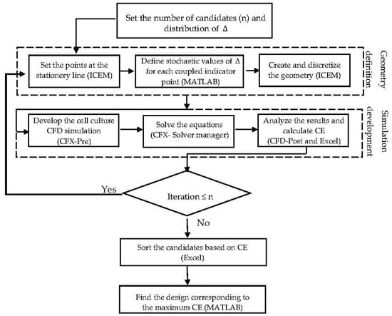 As discussed in the introduction, the design of a scaffold and bioreactor operating conditions are critical parameters, which have to guarantee a balance between nutrient supply rate, metabolite removal performance and physical environmental conditions. Modelling and simulation are powerful tools for estimating the level of effective factors—such as nutrients concentrations and other environmental factors like shear stress—to predict the state of a cell culture under various operating conditions. One of the main advantages of process simulation is that it offers the opportunity to better understand the ongoing phenomena and diagnose the design weaknesses and the potential bottlenecks towards achieving an optimal design. In this overall perspective, the geometrical aspects of the scaffold design are investigated in order to systematically explore an improved design for more efficient cartilage cell cultures. Hence, a CFD based stochastic algorithm was developed according to the following steps: