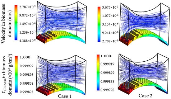 Figure 7. In this figure, the influence of the cultured fiber characteristics on the velocity profile and glucose distribution in biomass domain is shown for two different designs. The reported CFD results in this section were achieved by choosing the ‘Second Order Backward Euler’ solver with a constant time step (1 h), which is below the time dependency threshold of the simulation.