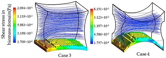 The specified curvature also has a direct influence on the level of induced shear stress by the flow. Simulation results predict a relatively higher maximum shear stress in biomass domain for higher curvature (0.16 Pa in case 1 and 0.4 Pa in case 2), while the average parameter indicates a lower value in the same design (average shear stress in biomass phase = 0.013 Pa in case 1 and 0.011 Pa in case 2). Since for a cell culture the average value of shear stress has a higher level of importance compared to its local maximum value, a lower curvature of the cultured surface is predicted to be more desirable. On the other hand, the available surface area for the cell attachment is a critical factor in the design of an efficient cell culture structure [