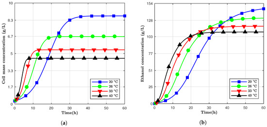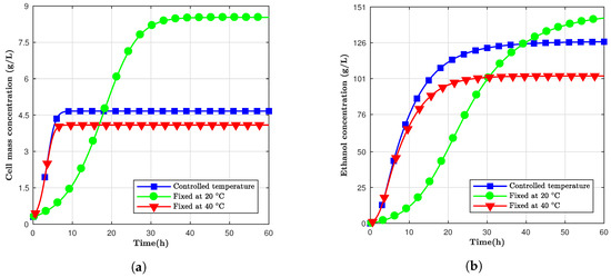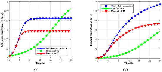 Figure 3 shows three different scenarios. From Figure 3a, it can be observed that cell mass concentration grew faster than the cells kept at 20 C; however, it did not reach the same pinnacle at the end of the sixty hours. Figure 3b shows the total ethanol mass versus time for 60 h and for fermentation at 20 C, 40 C and changing from 40 C to 20 C for the same period. The controlled temperature simulation had the highest yield until, approximately, 40 h past the start of the fermentation process, but the simulation kept at 20 C ended up having the highest concentration for both ethanol and cell mass. Therefore, depending on the time window, the controlling temperature could be more advantageous than maintaining it constantly.