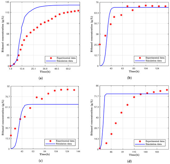 Overall, the computer model reached a constant ethanol concentration faster than the experimental data, as can be observed in Figure 2; however, the final production values were proximate to the models. Devantier et al. had a similar final ethanol concentration; however, there were significant differences over time, as seen from Figure 2a. For the Nguyen et al. results, the trend over time of the ethanol production was very different. However, the concentration of the alcohol at the end was very close for fermentation cases where the temperature was 37 C. Table 5 shows the difference of the final values on the ethanol production, and, as previously described, it can be observed that Nguyen et al., for the two fermentation data at 37 C, had the smallest differences.