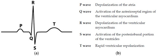 Ideal electrocardiogram (ECG) signal with key features indicated; (a) P wave, QRS complex, and T wave which play important roles in diagnosis abnormality of heart signal; (b) Features of an ECG signal; how and which part of heart is used to generates each feature [16].