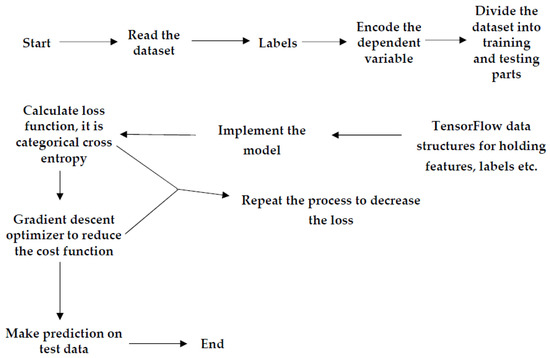 In the following step, the TensorFlow data structures was defined for holding features, labels etc., which includes defining weights, biases, hidden layers, activation tools, filters, filter size, placeholders for inputs, and desired output. There is also another tensor defined to store trained model output. This was followed by implementation and training of the model with the training dataset. Once the network is trained, it will calculate how far the trained model’s output is from the actual output. Then, the cross-entropy function will try to reduce this error to a minimum point. Once it reaches the minimum value, the trained model will give testing accuracy by performing training with a test dataset [24].