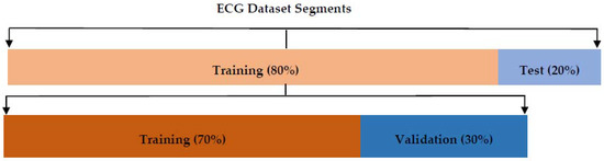 ECG data that was downloaded from PhysioBank.com and kaggle.com was used for the MLP and CNN algorithms, respectively, for training and testing. The MLP dataset had dimensions of (208, 61), where the 208 rows are the total ECG signals and the 61 columns are the total number of features and labels. The first 60 columns contain features, whereas the last column contains the label (diseases) of each individual signal. On the other hand, the CNN dataset had dimensions of (26,543, 60), following the same pattern as the MLP dataset, but this dataset contained 9 different labels. Both the algorithms used 80% of the total data for training and 20% for testing. Furthermore, the training dataset was divided into 70% for actual training and 30% for validation. Each ECG signal in the dataset was 10 s long and contained one rhythm class. An illustration of the distribution of ECG signals used for training, testing, and validation procedures can be seen in Figure 5.