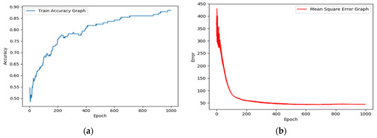 Accuracy and mean square error (MSE) graph of the MLP algorithm; (a) the accuracy of MLP increases as the number of epochs increases; (b) MSE reduces with every epoch and reaches the minimum point after 1000 epochs.