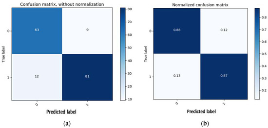 Confusion matrix (CM) with and without normalization of the MLP algorithm; (a) 63 arrhythmias and 81 normal signals are correctly classified, while 9 arrhythmias and 12 normal ECG signals are misclassified; (b) CM with normalization gives an accuracy in percentage; in this case, accuracy was 88% for arrythmia and 87% for normal sinus ECG.