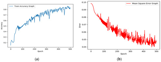 In next section, the deep neural network created as a convolution neural network to identify various cardiovascular diseases. The ReLU non-linear activation tool was used to activate the CNN along with the gradient descent optimizer which will minimize the error of network. This tool becomes very beneficial when the parameters cannot be calculated analytically (i.e., using linear algebra) [27]. As discussed earlier in the architecture of the CNN algorithm, each convolution layer has 32 filters and each filter has dimensions of 5 × 5. Figure 8 graphically shows the accuracy and MSE. The accuracy increases constantly with every epoch and after 500 epochs, reaches a value of 83.5%. Furthermore, the MSE reduces constantly with each epoch and at the end it reaches a minimum point.