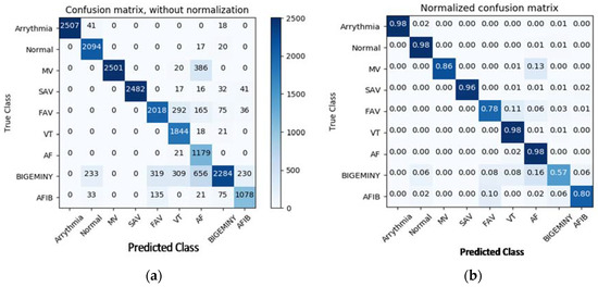 CM with and without normalization of the CNN algorithm; (a) most of the arrhythmia was correctly classified by CNN except bigeminy and FAV; those diseases might have the same characteristics as others; (b) normalized CM gives the accuracy of the CNN in percentage form.