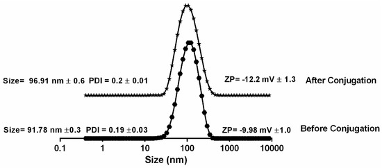 Liposomes are spherical vesicles made up of phospholipids [25]. Upon the hydration of a thin lipid film, MLVs were formed by vortexing and heating the suspension above the transition temperature (Tc) of the lipid. These MLVs could then be transformed into SUV by a variety of methods, including a probe sonication, which was used in this study. The liposomes were one of the most flexible structures that conjugate moieties, like lactose and peptide [22,28]. There was a slight change in the size of the liposome that was observed after the loading with RF-482 (Figure 1).