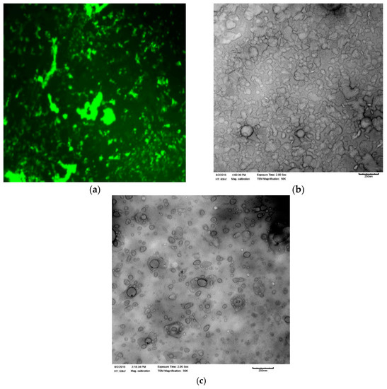 The average hydrodynamic size, before and after the liposome loading, was 91.78 nm ± 0.3 (PDI 0.2 ± 0.01) and 96.91 nm ± 0.6 (PDI 0.19 ± 0.03), respectively. However, no change was observed on the zeta potential of the liposomes before and after the peptide loading. The first confirmation of the association of the peptide with the liposome was observed when the FITC-labeled peptide RF-482 was used for the loading. After the separation of the unloaded peptide, the liposomal suspension was dried, covered with phosphotungstic acid for better resolution, and observed under the fluorescence microscope (Figure 2a). Subsequently, the empty liposomes, as well as the peptide-loaded liposomes, were imaged under TEM. The presence of protein was confirmed by a cloudy environment that was observed around the peptide-loaded liposomes (Figure 2b). This was not observed in the case of the empty liposomes (Figure 2c).