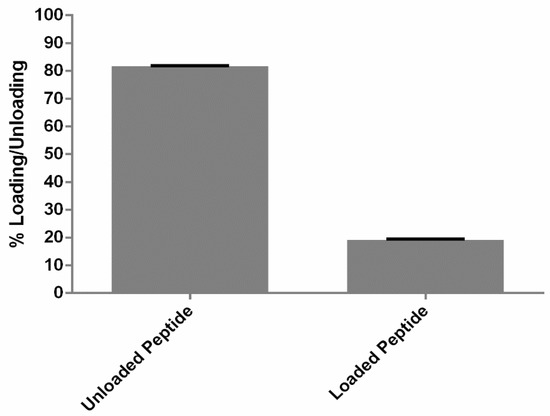 The exact mechanism of the protein–liposome association is still unknown. However, it was confirmed by the fluorescence microscopy as well as the TEM that the peptide RF-482 was associated with the liposomes. Since the association of the peptide–liposome was confirmed, it was necessary to quantify the amount of protein that was loaded with the liposomes. However, it was equally important to achieve the mass balance so as to study the actual amount of loading of the peptide. Hence, the BCA assay was performed for the analysis of both the eluent and liposome samples. It was confirmed that 81.7% ± 0.1% (n = 3) was not loaded and that 19.1% ± 0.4% (n = 3) was loaded (Figure 3). This also confirmed the 100% recovery of the initial amount of the peptide.