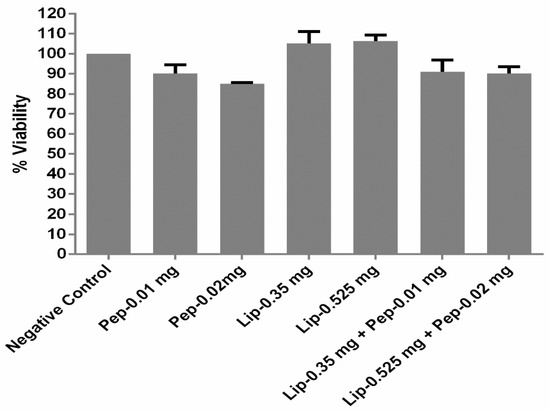 The peptide, liposomes, and peptide-loaded liposomes, all at two different concentrations, were tested for their cell toxicity. There was no toxicity observed with both of the concentrations of all of the samples. After 72 h of incubation, the observed cell viability was more than 80% (n = 3 ± SD) for the chosen concentrations of the peptide RF-482. Whereas, in the case of the liposome alone, both of the concentrations of lipids were found to be completely non-toxic. However, when the peptides were loaded on to the liposomes, the toxicity was reduced slightly, as the cell viability for the chosen concentrations were observed to be ~90% (n = 3 ± SD). (Figure 4).
